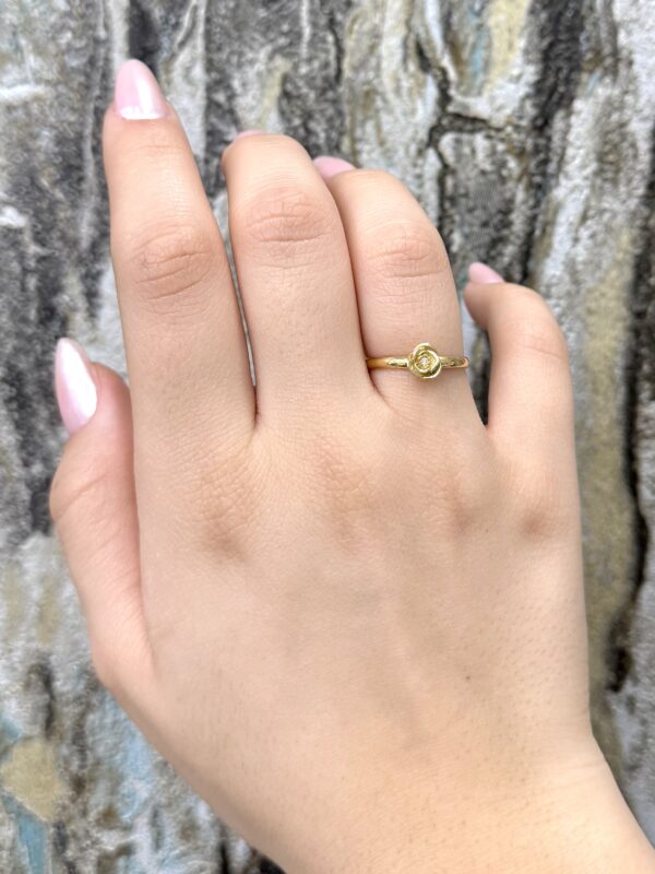Anelli Diamanti donna, Donna DiamantiAnello in oro giallo con diamante, caratterizzato da una raffinata montatura a rosa che avvolge la pietra centrale come un delicato bocciolo. Le linee morbide e avvolgenti della montatura richiamano la bellezza e il significato della rosa, simbolo di amore, promessa e rinascita, esaltando la luce del diamante in modo armonioso e naturale.