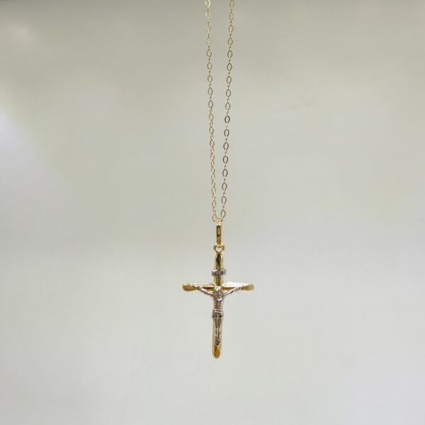 Ciondolo croce da 2,5 cm in oro bianco e oro giallo 18kt con cristo in rilievo.
