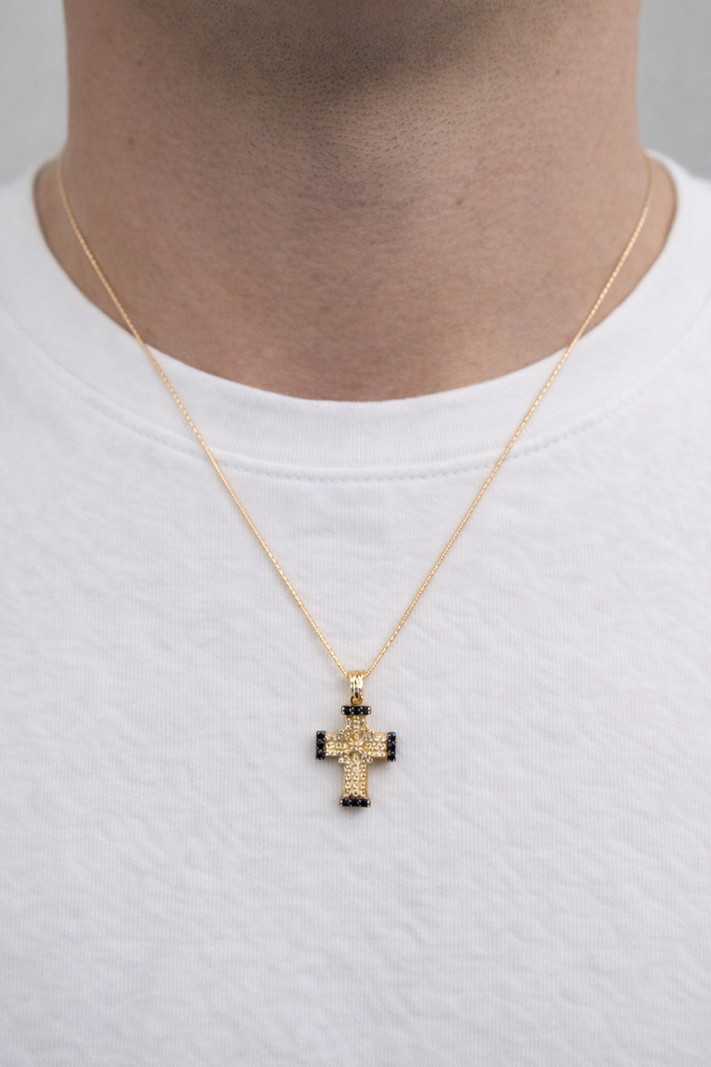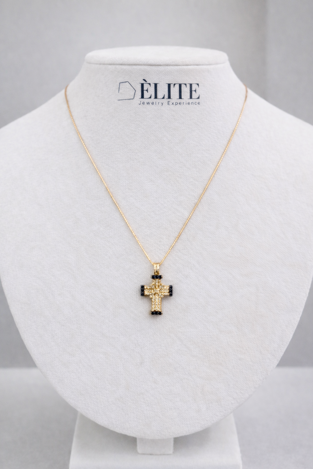 Croce in oro giallo con diamanti bianchi e diamanti neri.
