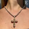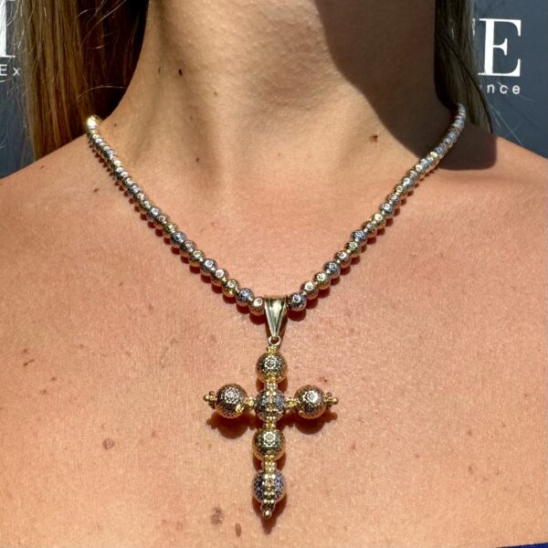 L’altezza della croce è di 4 cm, con sfere da 8mm in oro giallo, bianco e rosa.