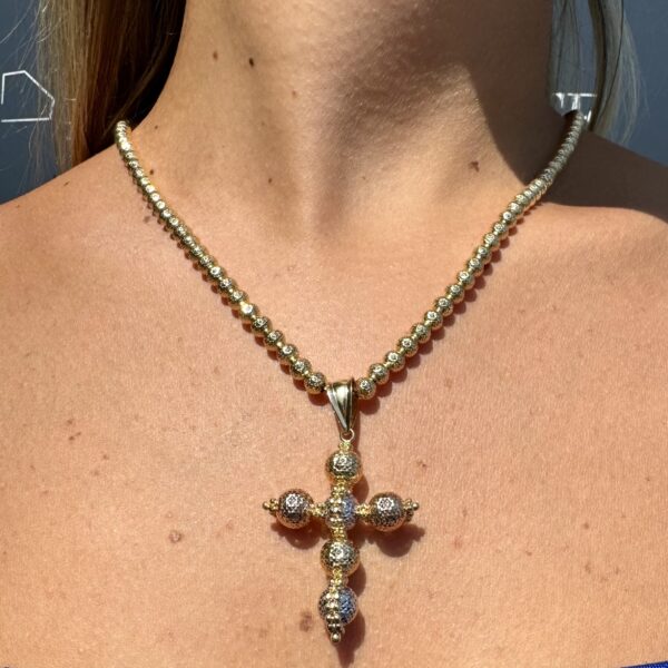 L’altezza della croce è di 4 cm, con sfere da 8mm in oro giallo, bianco e rosa.