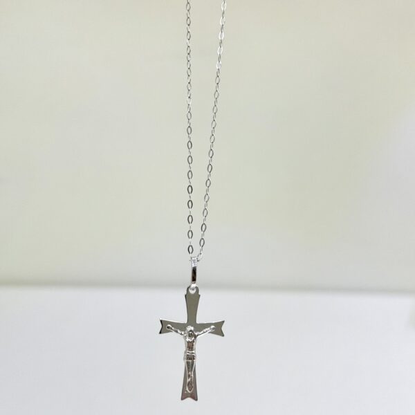 Croce con cristo in rilievo,liscia a lastra in oro bianco 18 kt.