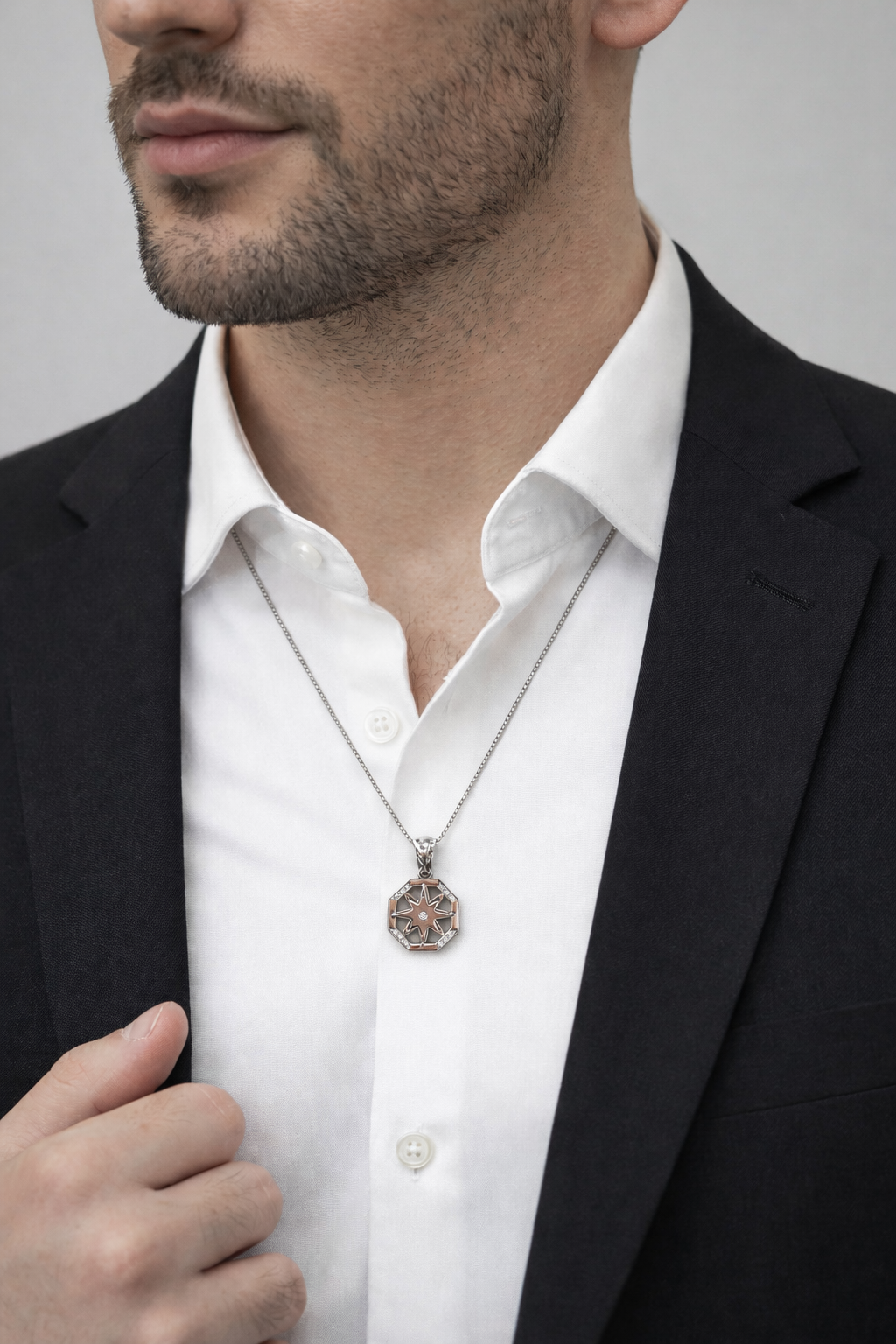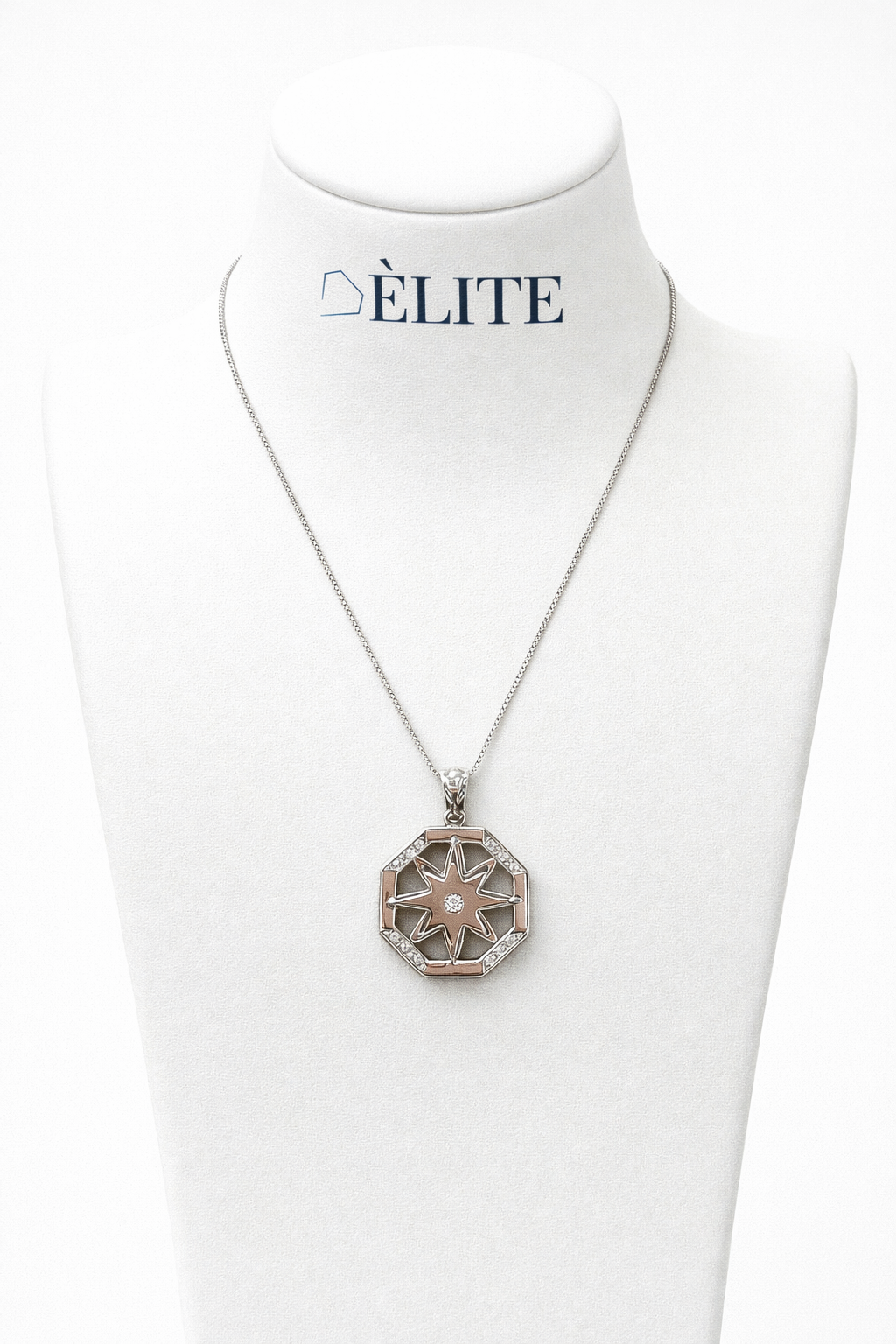 Collana in oro bianco e diamanti con ciondolo Rosa dei Venti, simbolo di guida e protezione. Il design raffinato unisce la luminosità dell’oro bianco allo scintillio dei diamanti, che incorniciano armoniosamente il ciondolo, esaltandone i dettagli e la profondità. Un gioiello senza tempo, pensato per chi ama l’eleganza discreta e il significato simbolico.
