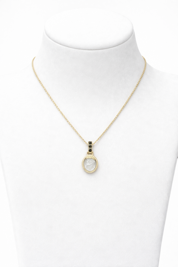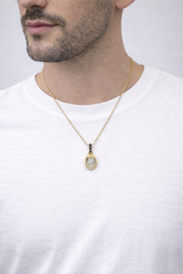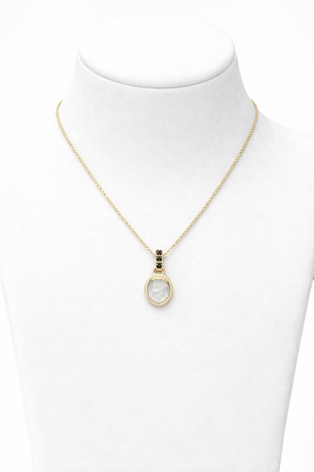 Collana in oro con ciondolo raffigurante il volto di Cristo, finemente lavorato e incorniciato da una montatura raffinata. La contromaglia impreziosita da tre diamanti neri dona un tocco distintivo e contemporaneo al gioiello, creando un elegante contrasto di luce. Un simbolo di fede e protezione, pensato per essere indossato con stile ogni giorno.