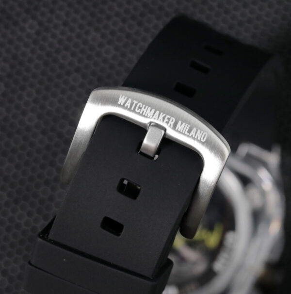 Cinturino integrato in silicone morbido al tatto con fibbia in acciaio inossidabile;